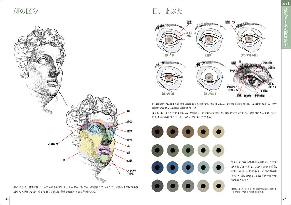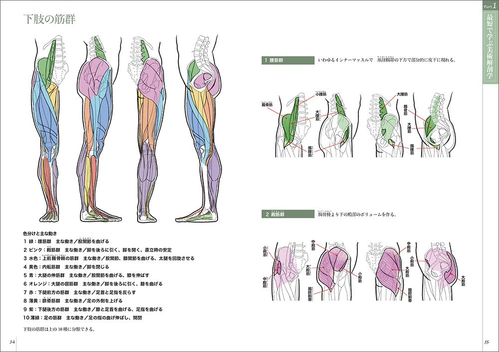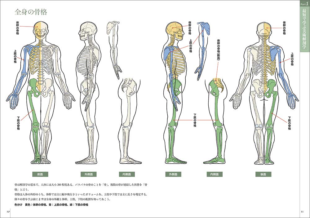 美術解剖学では骨格や筋肉の名前を覚えていくことも重要です。名前を覚えると機能や形について理解しやすくなりますし、それぞれの筋肉の繋がりを感覚的にも把握できるようになります。本書はわかりやすく筋肉や骨格に着色してあるので、部位の構造を覚える助けとなります。