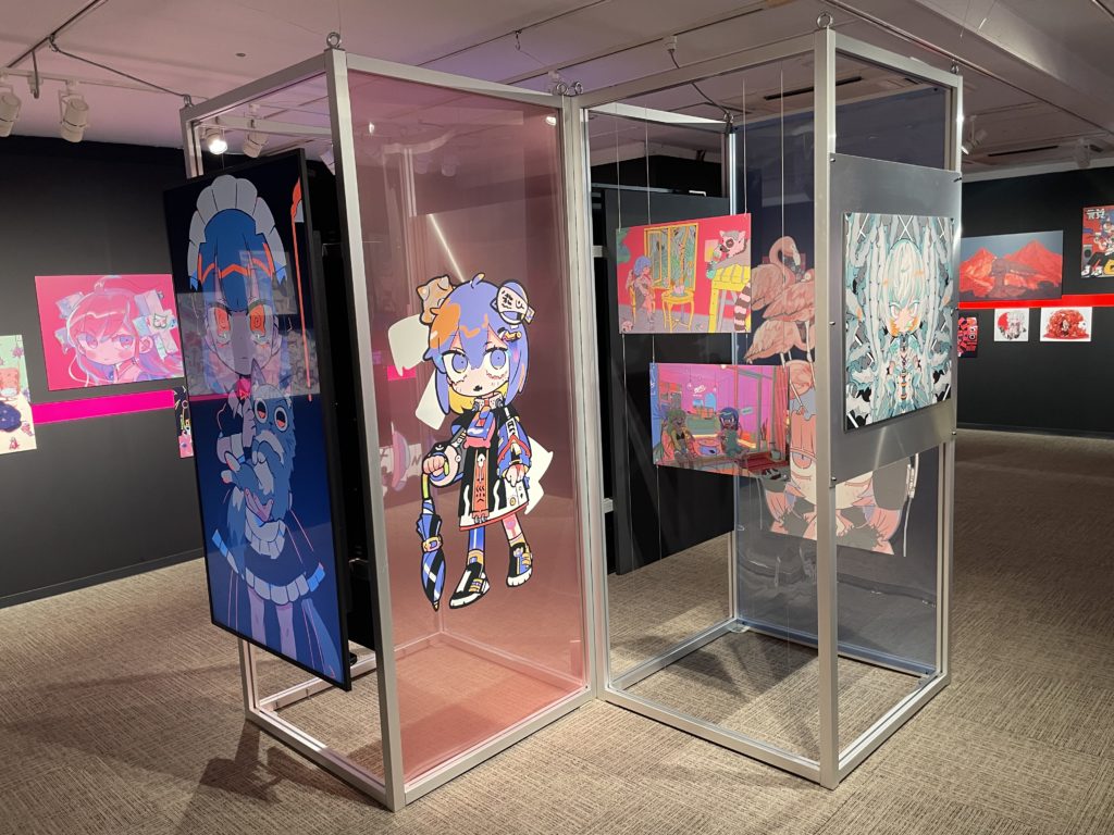 寺田てらさんは、ドイツでの10年間の生活を経て、その独特な色彩感覚とスタイルを確立しました(本人曰く、ドイツ語はほとんど覚えていないらしい)。音楽アーティストのMVイラストやアパレルブランドとのコラボレーションなど、幅広い分野で活躍しています。本展の会場では、Adoの『阿修羅ちゃん』やナナヲアカリの『チューリングラブfeat.Sou』など、MVで使用された作品も展示されており、ファンにとって見逃せない内容となっています。